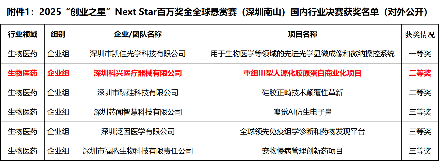 近日,科興制藥全資子公司-深圳科興醫療器械有限公司(簡稱“科興醫療器械”)的重組Ⅲ型人源化膠原蛋白商業化項目(GB14項目),在第十七屆中國深圳創新創業大賽南山創賽——2025“創業之星”NextStar百萬獎金全球懸賞賽(深圳南山)中脫穎而出,榮獲生物醫藥行業決賽企業組二等獎,公司研發實力得到認可。
