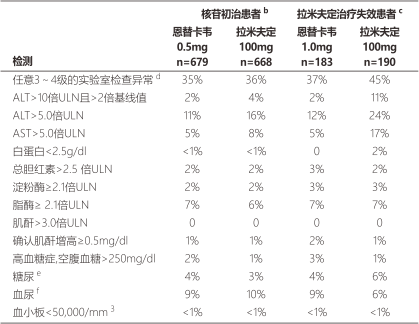 表3四項(xiàng)臨床試驗(yàn)中使用恩替卡韋和拉米夫定治療后,實(shí)驗(yàn)室檢查異常的發(fā)生頻率。